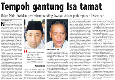 "BN juga bimbang isu tersebut akan menjejaskan kempennya, memandangkan wujudnya masalah dalaman antara Isa dan Menteri Besar, Datuk Mohammad Hassan,".
